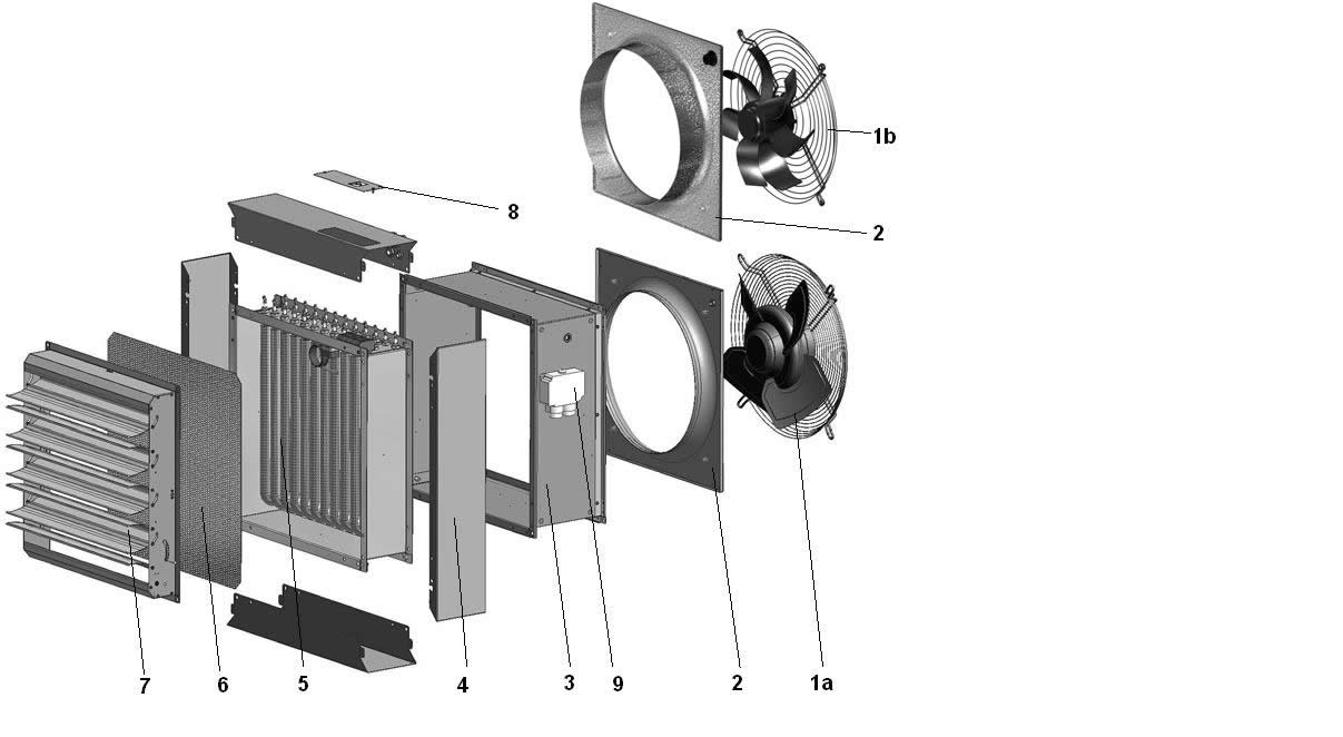 Elektrický 3 stupňový vykurovací register. K dispozícii 400V alebo 500V motory s krytím IP54. Zavesenie jednotky možné na stenu alebo strop. Vykurovací výkon od 4 - 42 kW.