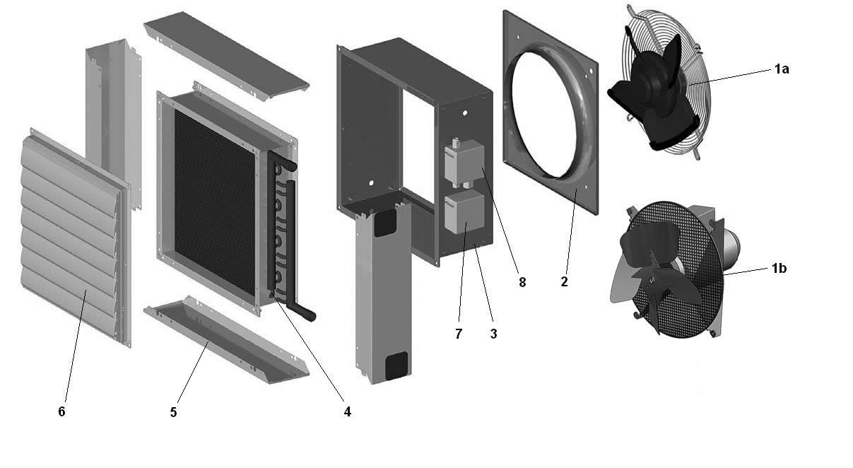 Axiálny ventilátor s elektromotorom a širokými lopatkami, 400V 2-otáčkový motor. Výmenník CU AL vyrobený z medených trubiek s profilovanými hliníkovými lamelami, vzdialenosť lamiel od seba 2,5 mm.